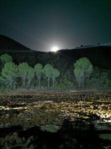 Später, nachdem wir am Zielbahnhof angekommen waren, konnten wir aussteigen und das selbst mitgebrachte Pick Nick geniessen. Wir setzten uns ganz nahe zum Fluss, doch die meisten Besucher gingen zu den gedeckten Tischen, wo es Geselligkeit nach spanischer Art, Musik und Gesang gab. Langsam konnten wir den Aufgang des Vollmondes hinter den Hügeln mitverfolgen. Eine mystische Landschaft, spärlich erhellt vom kalten Licht des Vollmonds. Auf der Rückfahrt wieder im Zug, hingen wir noch ein wenig unseren Gedanken nach und liessen unsere Blicke über die Landschaft schweifen, die nun wie Schatten an uns vorbeihuschte.