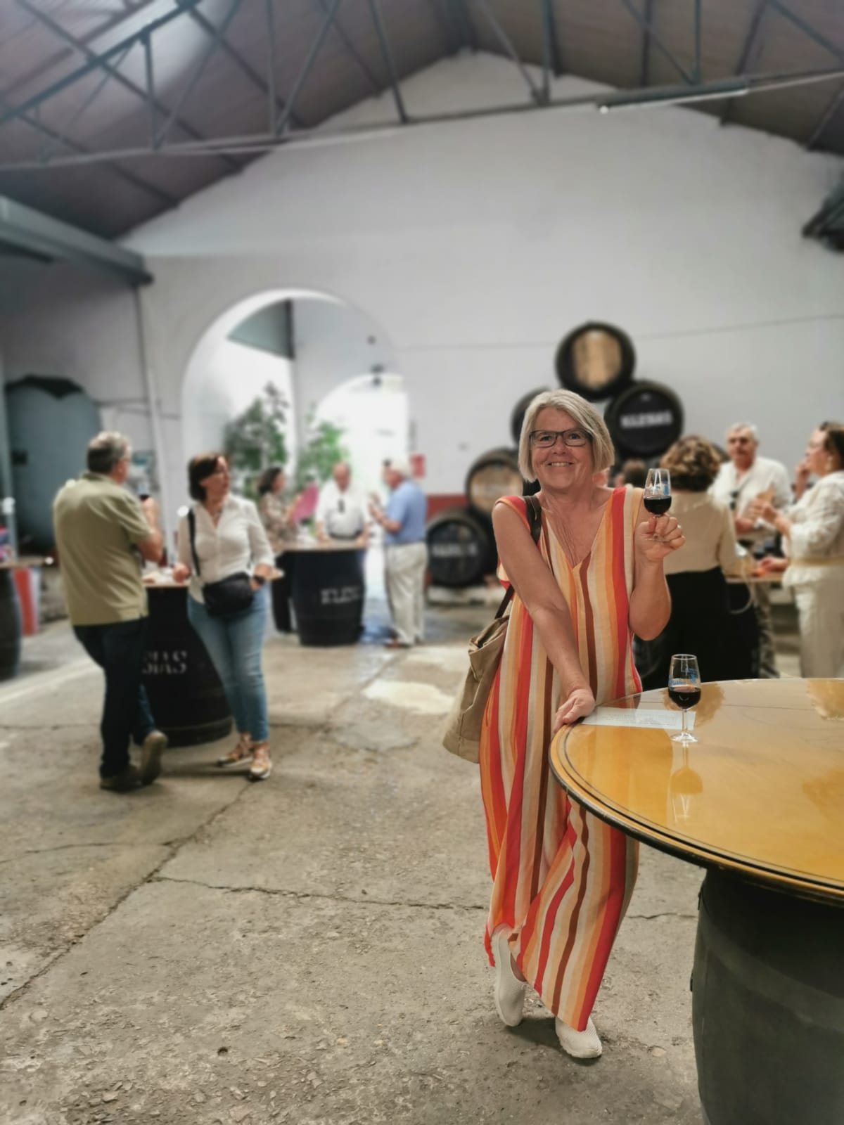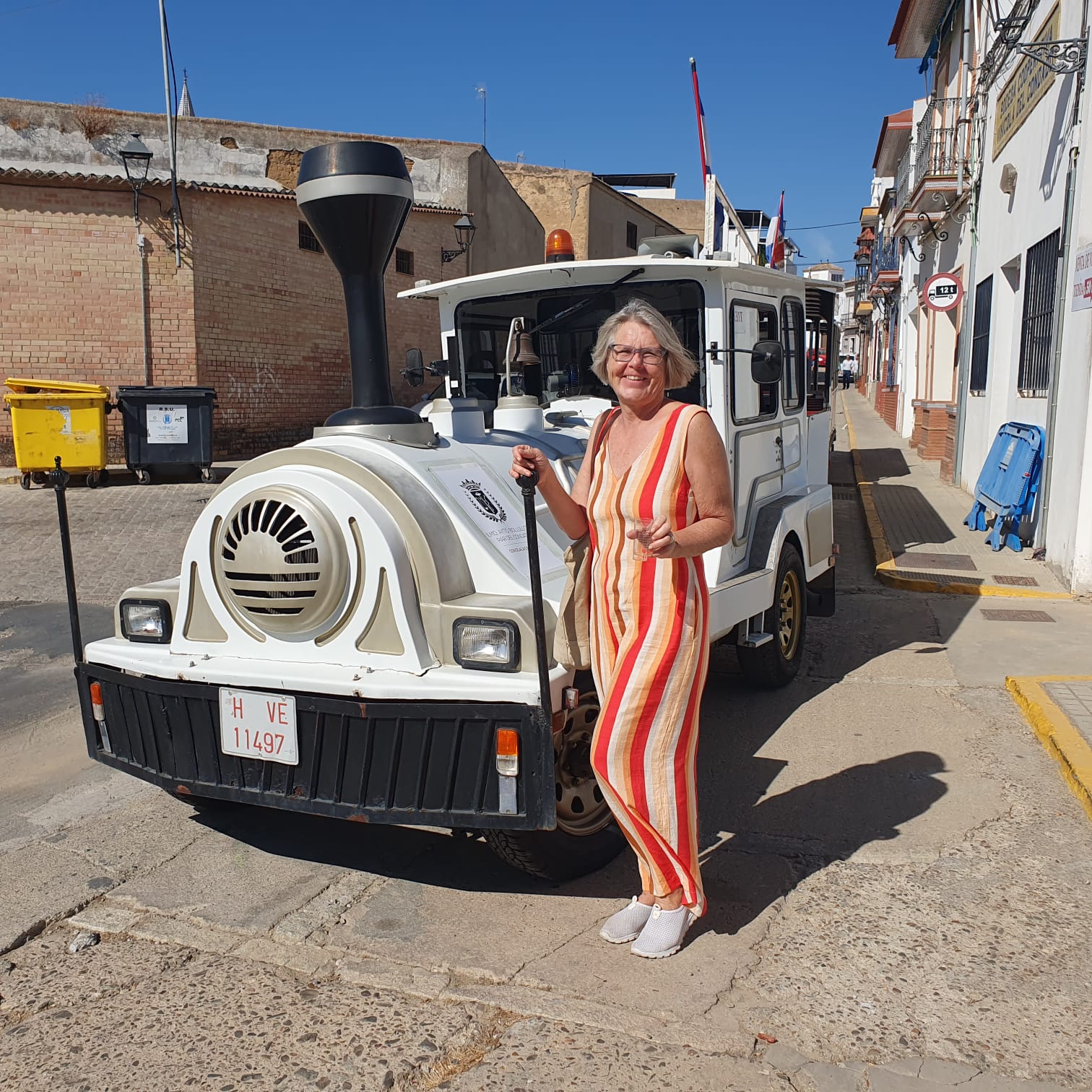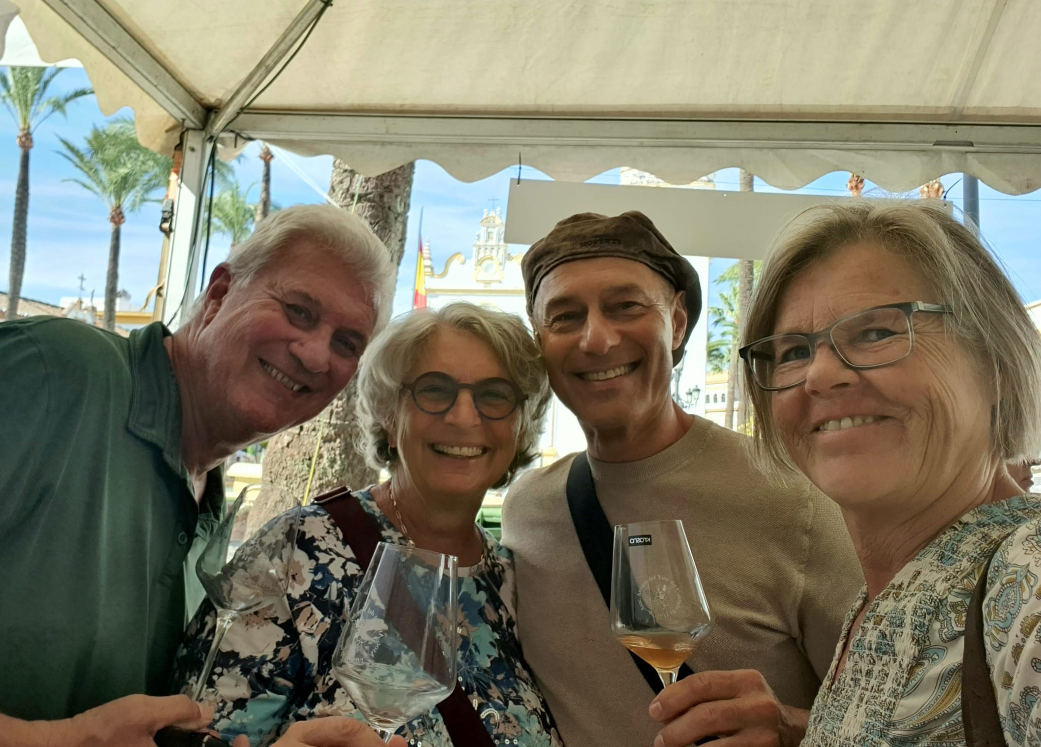 Wenn es in der Schweiz bei einer Degustation meistens nicht mehr als ein “feuchtes” Glas gibt, so wurde hier in Bollullos nicht gespart – und auch noch nachgefüllt 🍷Es war eine buntgemischte, gut gelaunte Besucherschar mit dabei und wir wurden mit dem kleinen Touristenzug von einer Bodega zur anderen gefahren. Die Stimmung wurde mit jeder Fahrt ausgelassener. Es wurde viel geschwatzt und gelacht.