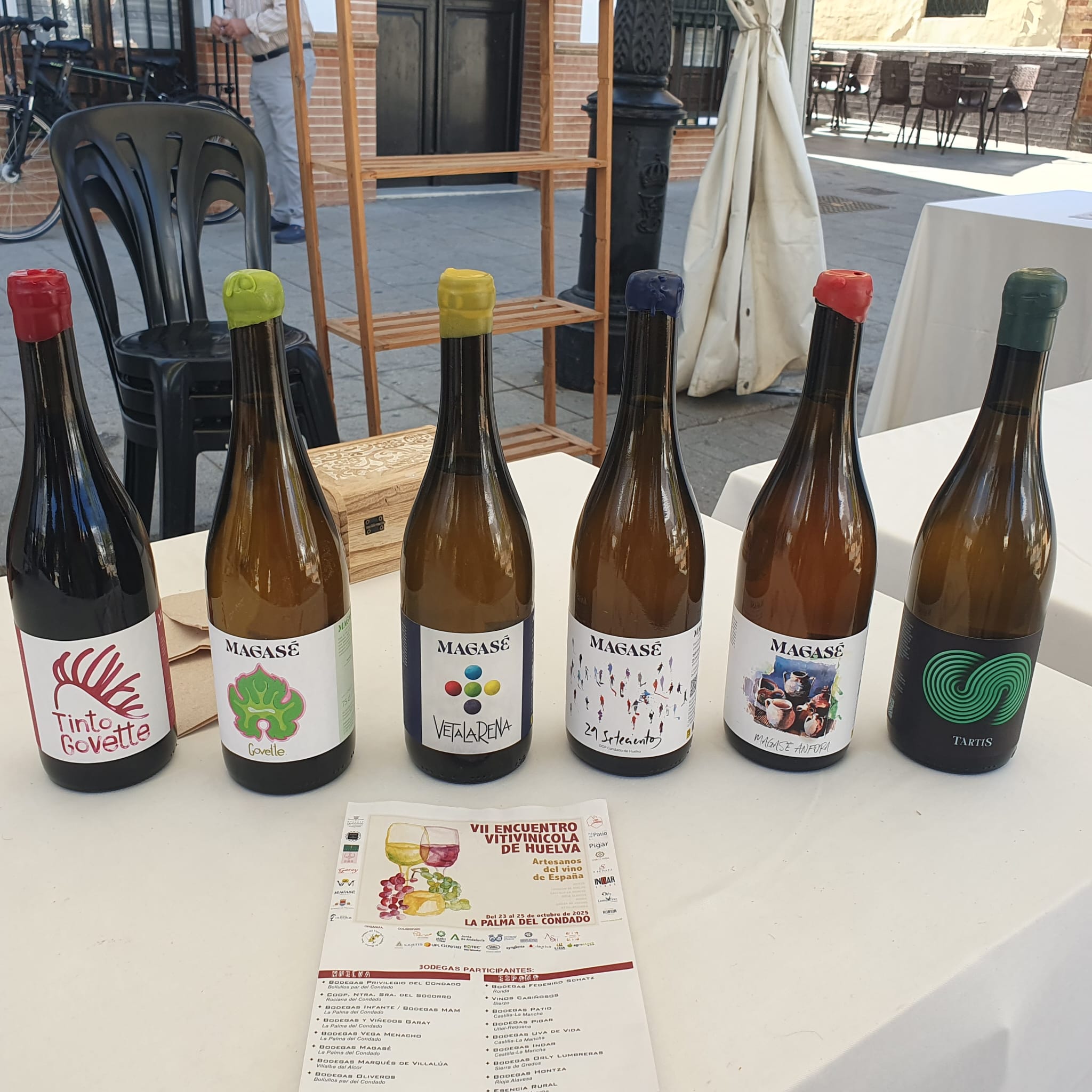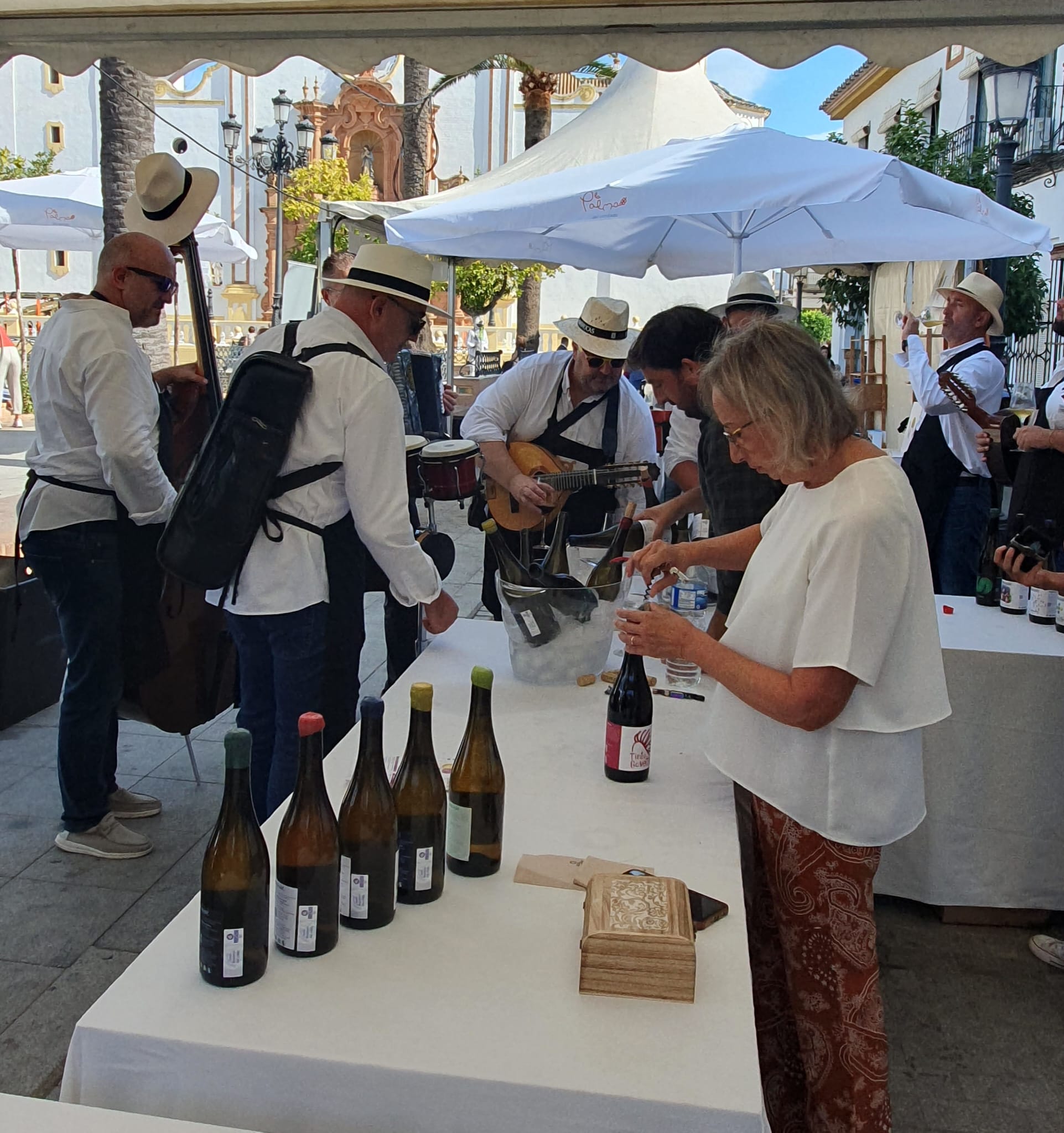 Aber auch in vielen anderen umliegenden Weindörfern feiert man die Traubenernte und vor allem die guten Weine 🍇 So auch in Palma del Condado, wo wir am Wochenende zusammen mit Freunden auf dem grossen Platz vor der Kirche mit dabei waren. Man konnte sich ein kleines Büchlein mit Gutscheinen kaufen, da war ein schönes Weinglas mit einbegriffen und die Möglichkeit insgesamt fünf Weine zu degustieren. Viele Spezialitäten wurden angeboten, nebst dem “Vino de Naranja” (Orangenwein) oder dem “Vermut” (kräftig und kräuterig) auch ein Wein, der einige Monate in neun Metern Tiefe im nahe gelegenen Atlantik reifen konnte. Die Flasche war von Muscheln besetzt und hatte einen ganz eigenen Geschmack. Nur schon die Idee ist genial…