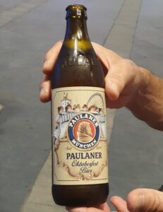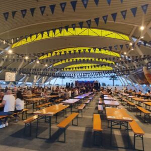 Schon nach dem Parkieren hörten wir die laute live Musik einer spanischen Band, wo sogar noch ein kleiner Junge an der E-Gitarre mit im Einsatz war. Festbänke standen aufgereiht und es waren bereits einige Besucher dort versammelt, die sich eines der diversen Biere (viele auch aus Deutschland) 🍺🍻 gönnten und die Zeit genossen. Es gab eine laaaaange Ausschanktheke und alles war gut organisiert. Doch die Laustärke der Musik verhinderte absolut jede Art von normaler Kommunikation. Man musste seine Bestellung seinem Gegenüber entgegenschreien oder – was besser funktionierte – mittels Deuten mit dem Finger verständlich machen. Der Ausschank funktionierte bestens, das Bier war wirklich lecker (besonders das Paulaner Spezialfestbier und das Weissbier), doch an ein gemütliches Zusammensein mit interessanten Gesprächen war nicht zu denken.