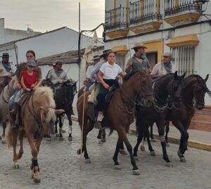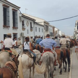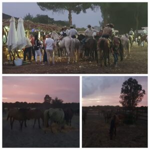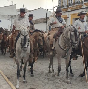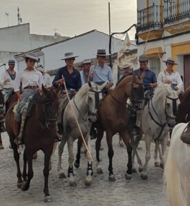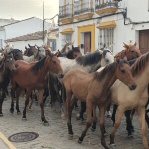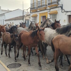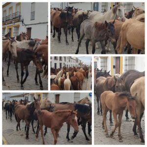 Gestern Sonntag gab es wieder einen totalen Szenenwechsel: Im Rahmen einer alten Tradition, der “Recogida de las Yeguas”, wurden die halbwilden Pferde in dem riesigen Doñana Naturschutzgebiet von ihren Besitzern zusammengetrieben und durch die Strassen und Gassen von Hinojos geführt. Wer sich für den Ort und seine Kultur interessiert, hier wäre ein Link dazu: