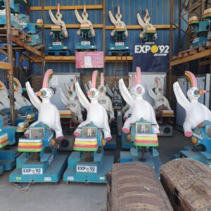 Der Vater von Alejandro, der uns durch seine Wunderwelt geführt hat und viele Anekdoten dazu erzählte, hat diese aussergewöhnliche Firma vor über 45 Jahren gegründet. Immer wieder tätigte er grosse Ankäufe. So fanden zum Beispiel 400 „Curros“ – das Maskottchen der Weltausstellung – ein neues Zuhause bei ihm. Heute stehen noch rund 40 Stück dort und werden weiterhin gekauft. Denn Curro und damit die Weltausstellung in Sevilla sind für viele Menschen eine Identifikationsfigur und ein Wendepunkt der Stadt. Viele haben schöne Erinnerungen daran – vielleicht selbst als Kinder einmal für 100 Peseten (damals gab es diese Währung noch) einen kleinen Schaukelritt absolviert. Heute sind sie selbst Eltern und zeigen Curro ihren Kindern.