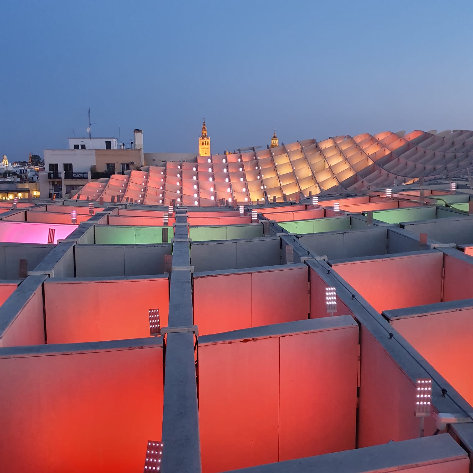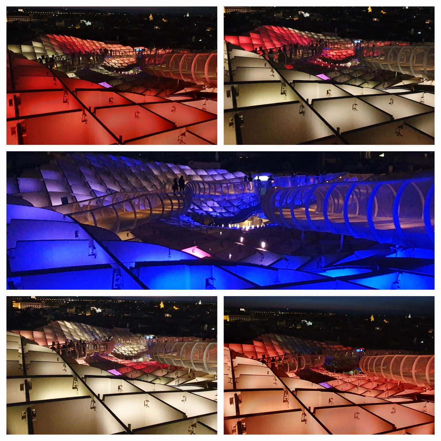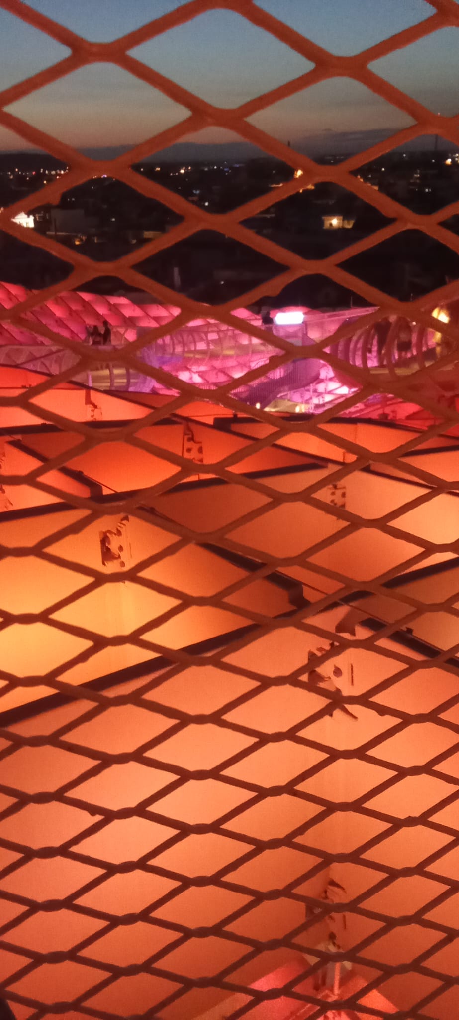 Aber ihren ganzen Charme entfaltet diese Konstruktion, wenn man es schafft zum Zeitpunkt des Sonnenuntergangs oben zu sein (man kann mit einem Fahrstuhl hochfahren, braucht dazu aber Tickets) und diesen von dort oben geniesst. Gleich darauf beginnen die Lichtspiele, wo sich die ganzen Setas in ein wogendes Meer an Farben verwandeln, die in Wellen über die Oberfläche ziehen.