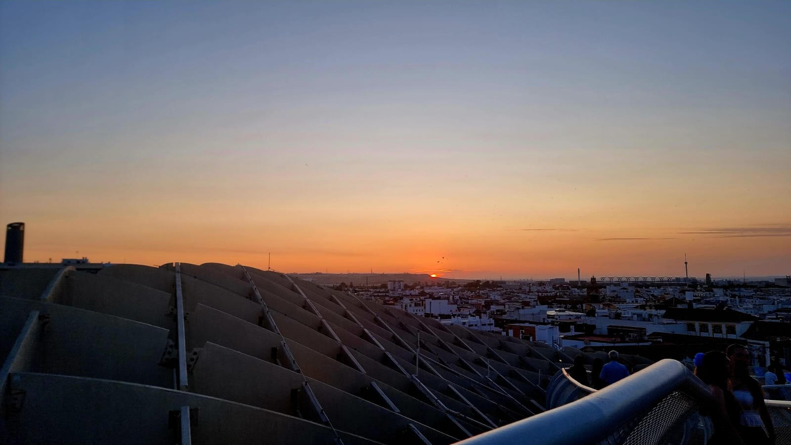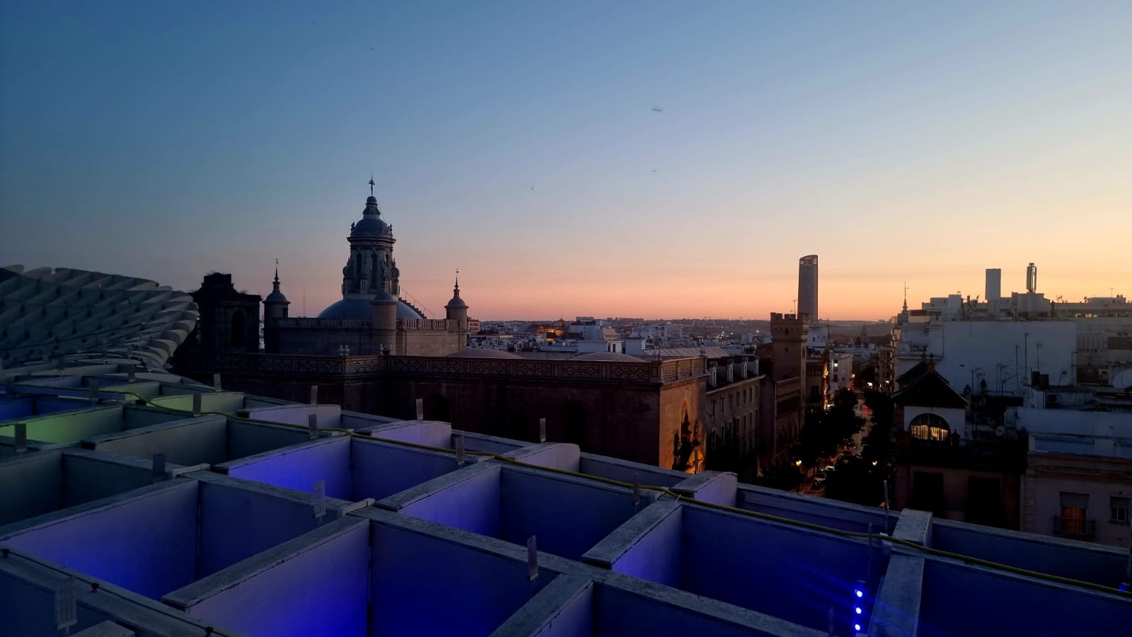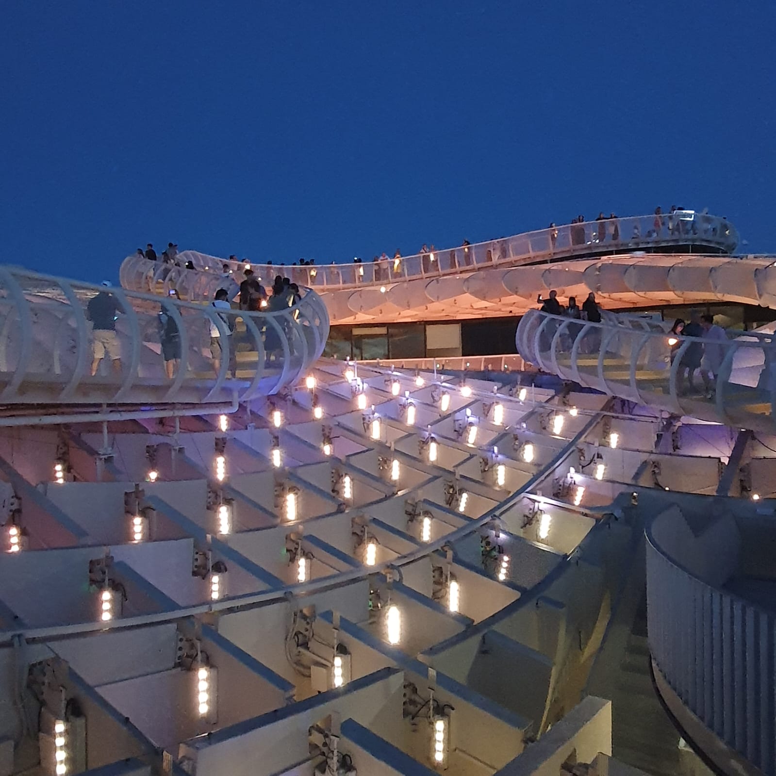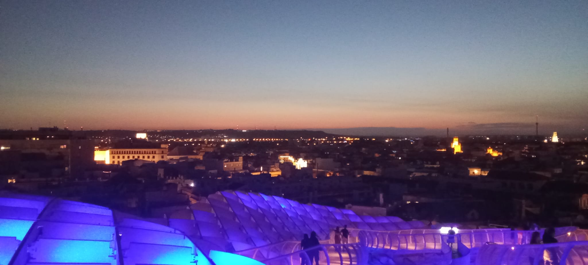 Aber ihren ganzen Charme entfaltet diese Konstruktion, wenn man es schafft zum Zeitpunkt des Sonnenuntergangs oben zu sein (man kann mit einem Fahrstuhl hochfahren, braucht dazu aber Tickets) und diesen von dort oben geniesst. Gleich darauf beginnen die Lichtspiele, wo sich die ganzen Setas in ein wogendes Meer an Farben verwandeln, die in Wellen über die Oberfläche ziehen.