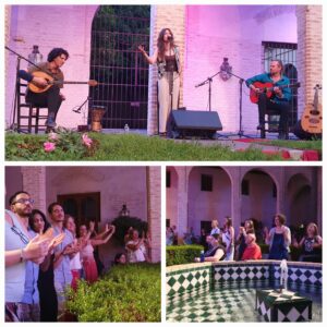 Drei Mal in der Woche. Doch das Beste daran ist: Es sind kostenfreie Konzerte. Doch wie kommt man an die Tickets ran? Man muss sich zu einer ganz bestimmten Zeit am Montag bei der entsprechenden Webpage einloggen und versuchen, eines der rund 200 Tickets zu ergattern. Dass dies nicht einfach ist, da diese Konzerte bei der Bevölkerung von Sevilla sehr beliebt sind, liegt auf der Hand. Dieses Mal hat es aber funktioniert und Esther konnte für uns zwei Plätze reservieren. Doch wir wussten eigentlich nicht, was für ein Konzert uns erwartet. Irgend etwas Orientalisches. Was wir aber dann geboten bekamen, hat uns absolut begeistert. Ein kleine, dreiköpfige Gruppe mit einer mitreissenden jungen Sängerin haben uns Lieder aus beiden Kulturen, der arabischen und der andalusischen, geboten und der Funke ist sichtlich auf das Publikum übergesprungen.